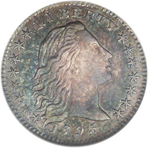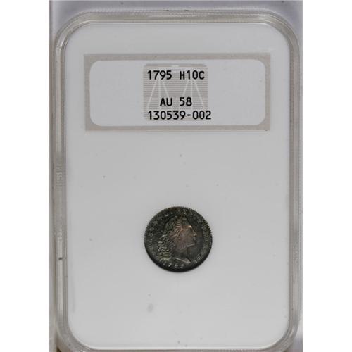 <B>1795<H10C> AU58 NGC.</B></I> V-5, LM-8, R.3. L is low and the IB in LIBERTY are distant on this variety. A die crack runs from the Y down to Liberty's nose, lightly over the face and neck, and joining the top of the 7 in the date. An early state of the obverse die, with no trace of the branching crack below the eye or from the rim through star 13, as described in the Logan-McCloskey reference. While this die pairing is readily available in all grades through Mint State, this example is noteworthy for its technical quality and aesthetic allure. No adjustment marks are seen on either side. Both sides radiate much luster underneath light rose-lilac and heather-blue patina. The reverse die is considerably rotated, bringing some of the reverse highpoints nearer their obverse counterparts and resulting in some central strike weakness on that side. A couple of light contact marks require a loupe to discern. A lovely and unassailably nice, near-Mint State specimen of this early and historic coinage.<BR><I>From The Royal Oak Collection.</B></I>