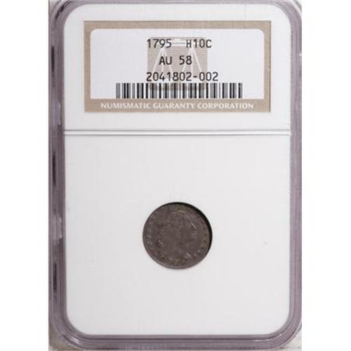 <B>1795 H10C AU58 NGC.</B></I> V-5, LM-8, R.3. Both sides are richly toned in speckled shades of gray and olive with undertones of numerous other colors present when viewed with a magnifier. A few light abrasions are also present, but these are unimportant for the grade. A satiny and typically struck example without apparent highpoint wear.<BR><I>From The Arnold & Harriet Collection.</B></I><BR><BR><B>Coin Engraver:</B> Robert Scot<BR><BR><b>Shipping:</b> Coins & Currency (<a target="_blank" href="http://www.heritageauctions.com/common/shipping.php">view shipping information</a>\)