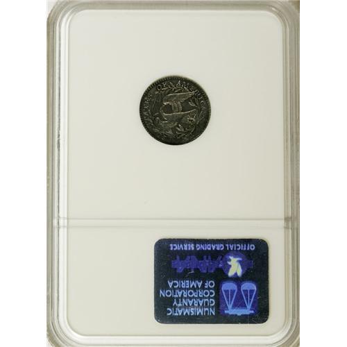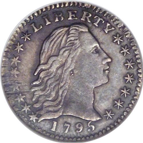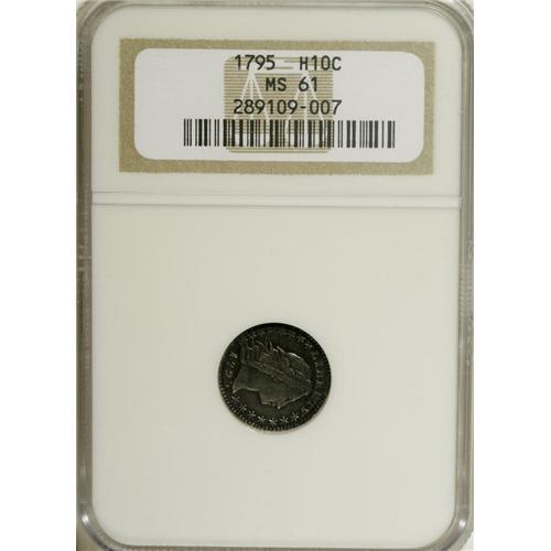 <B>1795 H10C MS61 NGC.</B></I> V-2, LM-3, R.5. The last year of the Flowing Hair half dime, which would be superseded the following year by the Draped Bust type. Ten varieties are identified for this year from the mintage recorded as 86,416 pieces, which includes the 1794-dated half dimes. Judging by the certified population data, the 1794 is about three times as rare as 1795-dated pieces. The rare LM-3 variety is identified by the prominent die crack that travels from the rim above the R in LIBERTY through most of Liberty's hair. This example shows deep charcoal-gray toning on each side with silver centers. The strike is bold, but the planchet was struck was struck from slightly misaligned dies with the obverse a bit weak at 9 o'clock on each side. A good opportunity for the specialist.<BR><BR><b>Shipping:</b> Coins & Currency (<a target="_blank" href="http://www.heritageauctions.com/common/shipping.php">view shipping information</a>)
