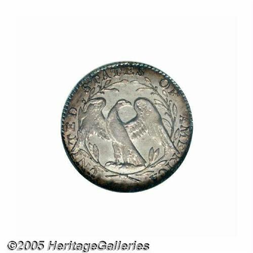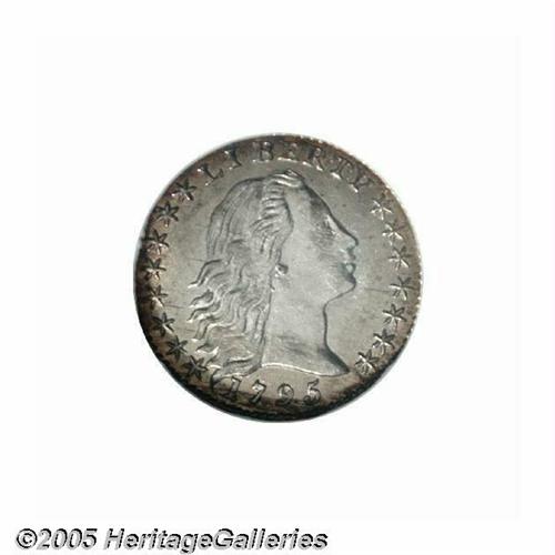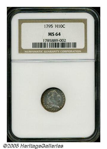 <B>1795<H10C> MS64 NGC.</B></I> LM-8, V-5, R-3. A die crack (as made) through the Y in LIBERTY to Liberty's nose is paired with a reverse that has a pair of berries below the first T in STATES. Silver-gray in color and lustrous in the fields as expected for the grade, darker antique-gold and tan shades accent the outer border areas. The strike is well above average for the issue, with only slight weakness on the upper curls of Liberty, the eagle's breast and right (facing) wing. Of importance to the collector is the lack of normally seen adjustment marks on either side. Several thin diagonal grease stains (as struck) are seen on the obverse and almost 45 degrees of clockwise die rotation is also noted. A conditionally elusive example of this second year issue. Population: 29 in 64, 18 finer (5/05).
