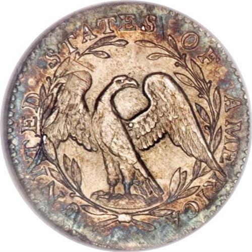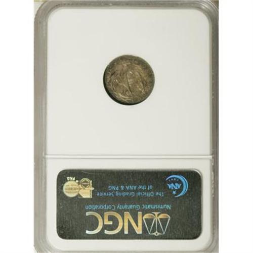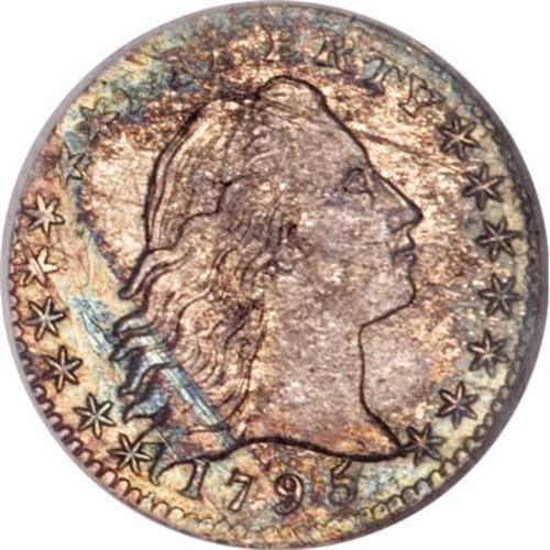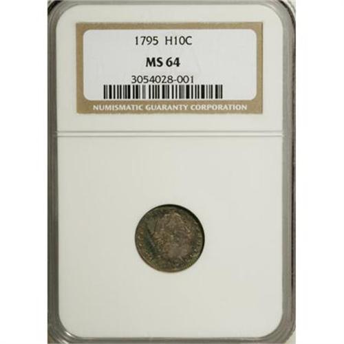 <B>1795 H10C MS64 NGC.</B></I> V-4, LM-10, R.3. This pleasing Choice Flowing Hair half dime is attractively toned in ocean-blue and caramel-gold. No abrasions are visible, although marks on the planchet prior to the strike remain visible in two places, the peak of the left (facing) wing and on the lower hair tresses. These have no impact on the technical grade, as they occurred prior to coinage. Struck from clashed dies. Satin luster shimmers across the undisturbed fields and devices. This type was produced for only two years. The portrait of Liberty was influenced by the Liberty Cap bust on cents and half cents introduced in 1793. Census: 29 in 64, 19 finer (3/08).<BR><BR><B>Coin Engraver:</B> Robert Scot<BR><BR><b>Shipping:</b> Coins & Currency (<a target="_blank" href="http://www.heritageauctions.com/common/shipping.php">view shipping information</a>)