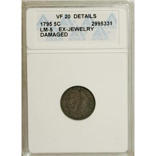 <B>1795 H10C --Damaged, Ex-Jewelry--ANACS. VF20 Details.</B></I> LM-5. NGC Census: (4/294). PCGS Population (29/360). Mintage: 78,600. Numismedia Wsl. Price for NGC/PCGS coin in VF20: $1,825. (#4251)<BR><BR><B>Coin Engraver:</B> Robert Scot<BR><BR><b>Shipping:</b> Coins & Currency (<a target="_blank" href="http://www.heritageauctions.com/common/shipping.php">view shipping information</a>\)