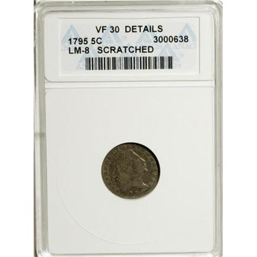 <B>1795 H10C --Scratched--ANACS. VF30 Details.</B></I> V-5, LM-8, R.3. Liberty's portrait has parallel and relatively deep adjustment marks, as made, although a couple of faint pinscratches are also present near the eye and on the cheek. Nonetheless, this dove-gray Flowing Hair half dime is decidedly more impressive than the ANACS grade and notations suggest.<BR><I>From The Laguna Niguel Collection, Part Two.</B></I><BR><BR><B>Coin Engraver:</B> Robert Scot<BR><BR><b>Shipping:</b> Coins & Currency (<a target="_blank" href="http://www.heritageauctions.com/common/shipping.php">view shipping information</a>)