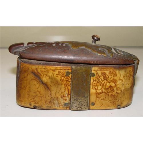 1795 Imperial Russian engraved bronze and wooden jeweled lidded box with various engraved scenes, hinged wooden lid with imperial double eagle mount, the small pull is set with a large semi-precious stone, hinge marked 1795.