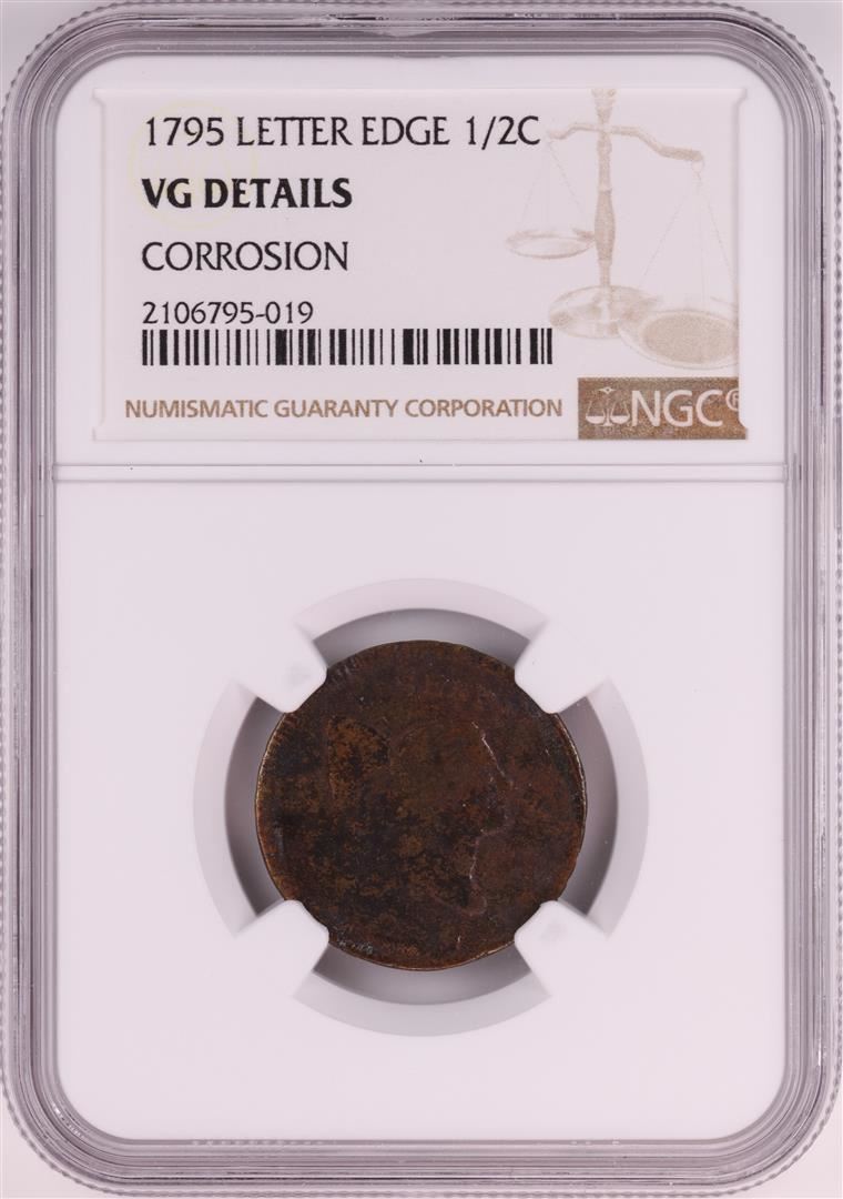 One 1795 Liberty Cap Letter Edge Half Cent Coin NGC VG Details. NGC Certified.