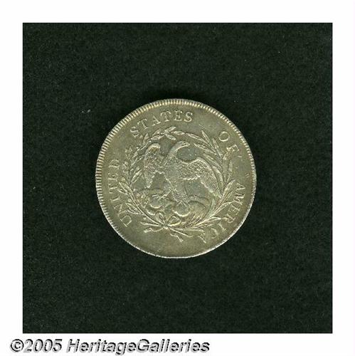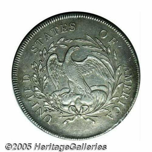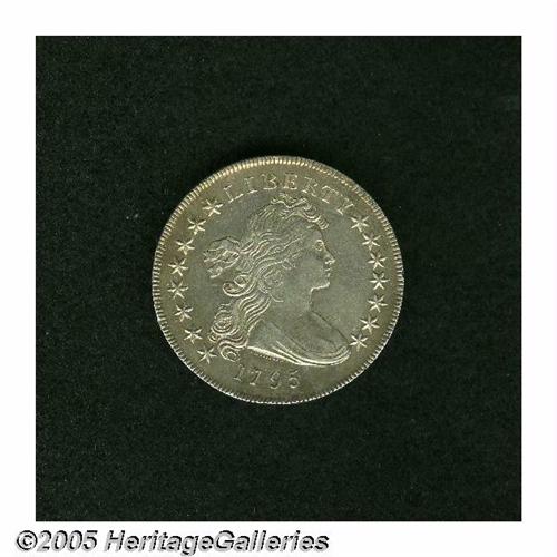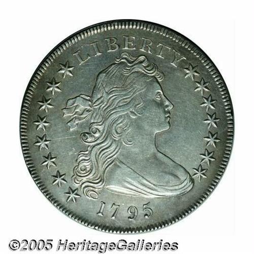 <B>1795<S$1> Draped Bust, Centered AU50 Repaired, Cleaned, Uncertified.</B></I> B-15, BB-52, R.1. Die State IV. The reverse exergue has been smoothed and whizzed, however, no sign of repair is opposite on the upper obverse. Light chestnut-gray in color, the smooth surfaces are slightly subdued from a past cleaning. A bold example with light wear on the eagle's breast and leg.