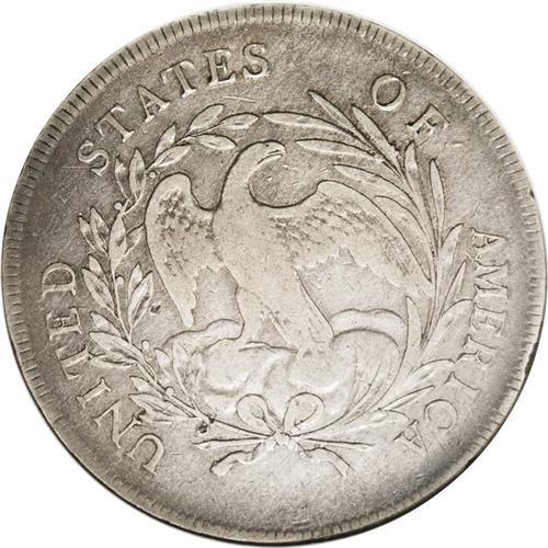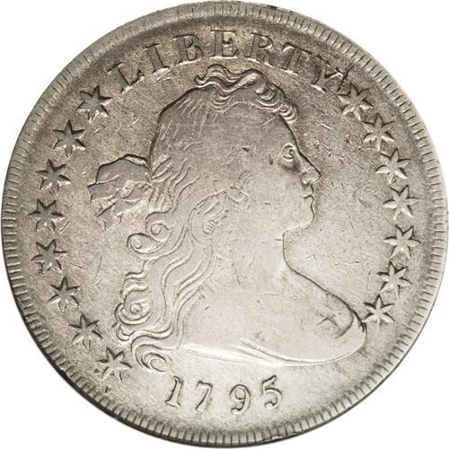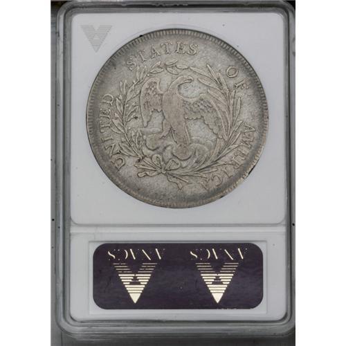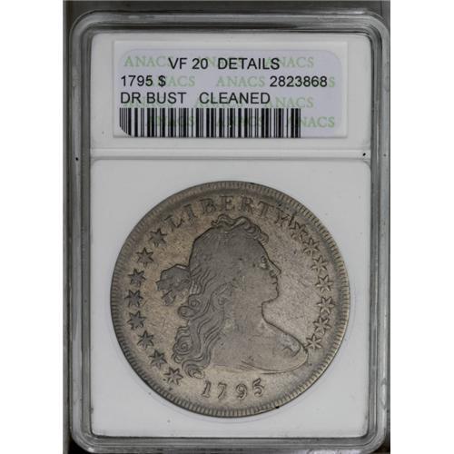<B>1795<img border='0' src='http://www.heritagecoins.com/images/star.gif' width=10 height=10>$1> Draped Bust, Centered--Cleaned--ANACS. VF20 Details.</B></I> B-15, BB-52, R.2. The highest wave of Liberty's hair is directly beneath the E in LIBERTY, and there is a leaf below the A in STATES. A couple of die lumps reside to the right of the F in OF. Silver-gray surfaces reveal some light hairlines, and a couple of small punch marks occur on the reverse. Both sides exhibit nice details. There are no noticeable adjustment marks. <BR><BR><B>Important notice:</B> Heritage usually auctions material at the rate of 200-250 lots per hour. On some occasions eBay Live bid software or the Internet may not be able to keep up with the pace of the auction. We recommend placing a realistic absentee bid now as insurance to avoid disappointment. Occasionally the auctioneer may eliminate or reject an eBay Live bid, and the auctioneer may also reopen a lot after the close of the eBay live bidding (usually because we missed an audience bid), and may reject your bid even if it shows you as the winning bidder. By bidding via eBay Live, you agree that Heritage may award the lot to another bidder at its sole discretion under the circumstances described above or any other reasonable circumstances. Since eBay bids are not shown to us until we open the lot on the floor, we treat those bids just like floor bids. In most cases the floor responds before the eBay bid is presented to us, due to Internet lag time, so for consistency we have made it a policy that floor bids are always considered first over tie eBay live bids. Also please note that all Heritage lots purchased through eBay Live carry a 20% Buyer's Premium. Please make sure you read the Terms and Conditions before you bid. This lot is being auctioned in conjunction with a live floor auction by Heritage Galleries & Auctioneers. All final auction and invoice information will be supplied by Heritage Galleries & Auctioneers, and all other information should be considered preliminary. Lot:2112 <BR><BR><B>Winning Notification and Billing:</B> After the FINAL session in this auction is complete, Heritage will send e-mail and snail mail invoices. This process normally takes several days. All final auction and invoice information will be supplied by Heritage Galleries & Auctioneers, and all other information should be considered preliminary. <BR><BR>This auction will be conducted on a live auction floor and over the Internet through eBay Live. If you choose to place an absentee bid, please take a moment to <font color='#0000ff'><u><a href='http://pages.ebay.com/liveauctions/help/before/laabsentee.html'>learn how eBay Live absentee bidding works</a></u></font><font color='#000000'>