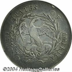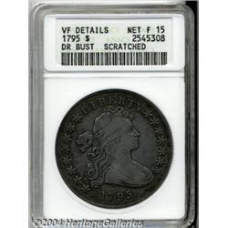 <B>1795<S$1> Draped Bust, Centered--Scratched--ANACS. VF Details, Net Fine 15.</B></I> B-15, BB-52, R.1. A pinscratch near the denticles completes a circle across the obverse. A pinscratch near the F in OF and another above the bust truncation are also encountered. The reverse rim has a minor ding at 1 o'clock. Liberty's hair tresses and the eagle's wings retain considerable definition. Steel-gray and chestnut patina aids the eye appeal. <BR><BR><B>Important notice:</B> Heritage usually auctions material at the rate of 200-250 lots per hour. On some occasions eBay Live bid software or the Internet may not be able to keep up with the pace of the auction. We recommend placing a realistic absentee bid now as insurance to avoid disappointment. Occasionally the auctioneer may eliminate or reject an eBay Live bid, and the auctioneer may also reopen a lot after the close of the eBay live bidding (usually because we missed an audience bid), and may reject your bid even if it shows you as the winning bidder. By bidding via eBay Live, you agree that Heritage may award the lot to another bidder at its sole discretion under the circumstances described above or any other reasonable circumstances. Since eBay bids are not shown to us until we open the lot on the floor, we treat those bids just like floor bids. In most cases the floor responds before the eBay bid is presented to us, due to Internet lag time, so for consistency we have made it a policy that floor bids are always considered first over tie eBay live bids. Also please note that all Heritage lots purchased through eBay Live carry a 20% Buyer's Premium. Please make sure you read the Terms and Conditions before you bid. </span></font></tr></table></td></tr></table>