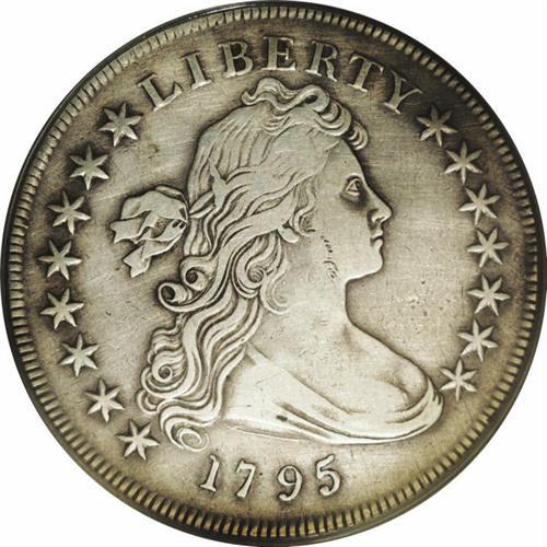 <B>1795<img border='0' src='http://www.heritagecoins.com/images/star.gif' width=10 height=10>$1> Draped Bust, Centered VF20 PCGS.</B></I> B-15, BB-52, R.2. This richly detailed older holder example has the sharpness of a higher grade, however, the slate-gray surfaces are moderately hairlined. The vertical die break within Liberty's hair is relatively advanced, and resembles Chimney Rock on the Nebraska Statehood quarter.