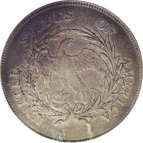 <B>1795<img border='0' src='http://www.heritagecoins.com/images/star.gif' width=10 height=10>$1> Draped Bust, Off Center VF25 PCGS.</B></I> B-14, BB-51, R.2. Misattributed on the PCGS holder as "Center Bust." Actually, this is the slightly earlier variety with the bust shifted too far to the left. The high wave of Liberty's hair curl is directly under the B in LIBERTY, and the first star touches Liberty's second lower hair curl at two points. This example has an even layer of deep olive-brown-gray toning across both obverse and reverse. The remaining design details are more than adequate, for the VF25 grade level. Obverse stars 8 through 14 are flat in the centers, but most other areas of the design are sharply detailed. The attractive, original surfaces are very smooth and free of any noticeable marks or abrasions.