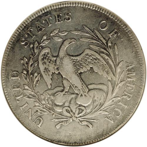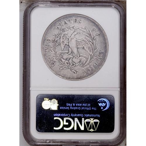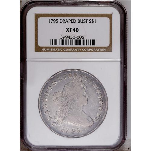 <B>1795<img border='0' src='http://www.heritagecoins.com/images/star.gif' width=10 height=10>$1> Draped Bust, Centered XF40 NGC.</B></I> B-15, BB-52, R.2. Die State II. The highest wave of Liberty's hair is directly beneath the E in LIBERTY. There is a leaf below the A in STATES. A small two-pronged die lump rests on the outer edge of the palm branch directly below the upright of F in OF. A couple more die lumps reside between F in OF and A in AMERICA. Well struck except for inevitable incompleteness on most of the obverse stars, with an appropriate degree of wear for the grade and a pleasingly original appearance overall. Moderate adjustment marks are noted on the reverse, mainly near the periphery. Lacking severe abrasions, this is an attractive and highly desirable Draped Bust dollar, for the XF40 grade level.