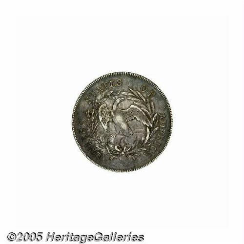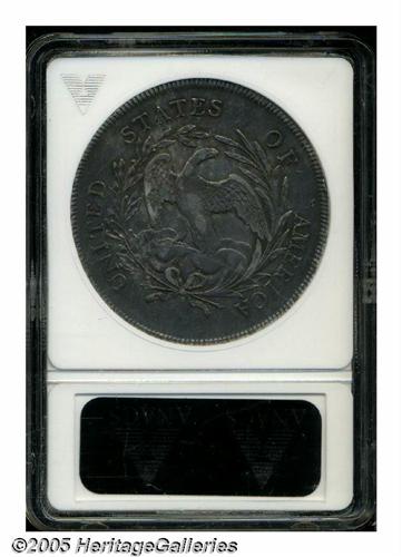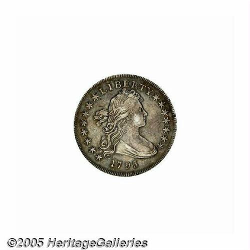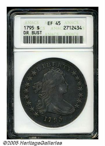<B>1795<S$1> Draped Bust, Centered XF45 ANACS.</B></I> B-15, BB-52, R.1. An original, steel-gray example of this first-year Draped Bust Dollar. This coin is sharply struck in all areas, and the light overall wear has not resulted in any areas of distracting loss of detail. A contact mark in Liberty's hair is the only mentionable post-production distraction, and there are several adjustment marks, also at the center of the obverse. Certainly a worthwhile specimen.