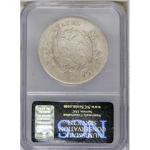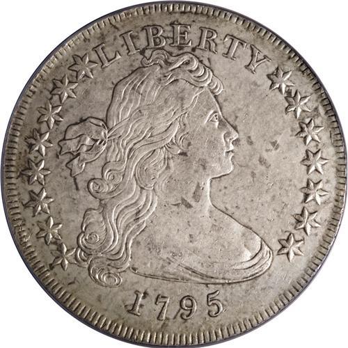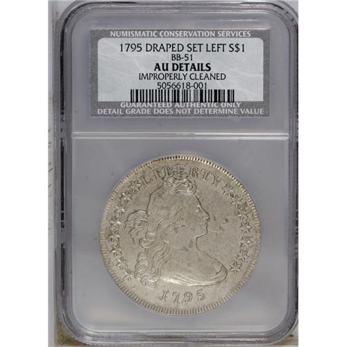 <B>1795 S$1 Draped Bust, Off Center--Improperly Cleaned--NCS. AU Details.</B></I> B-14, BB-51, R.2. This is the Uncentered Bust variety with the draped representation of Liberty set too far to the left, or in the case of the original die, too far to the right. The surfaces are glossy and subdued, but the devices are sharp and retain glimmers of luster. There are no obtrusive marks.<BR><BR><b>Shipping:</b> Coin/Currency (<a target="_blank" href="http://www.heritageauctions.com/common/shipping.php">view shipping information</a>)