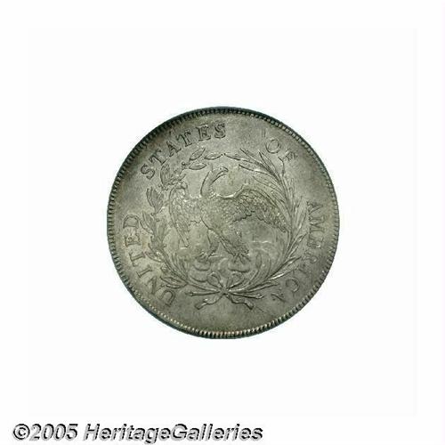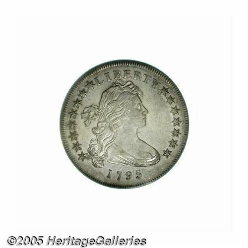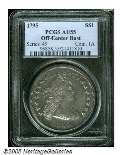 <B>1795<S$1> Draped Bust, Off Center AU55 PCGS.</B></I> B-14, BB-51. After the BB-27 and BB-21 varieties of the Flowing Hair type, BB-51 is the most common 1795-dated Silver Dollar. The obverse can also be distinguished by the placement of the top hair curl directly below the B in LIBERTY. This attractive silver-gray representative retains much of its original luster and is well defined in nearly all areas. A few splashes of golden color are noted about the reverse border. One of the nicer 1795 "Bust Left" Dollars we have offered in recent sales.<BR><I>From The Melrose Bay Collection.</B></I>