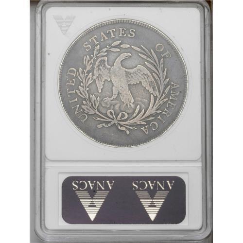 <B>1795<img border='0' src='http://www.heritagecoins.com/images/star.gif' width=10 height=10>$1> Draped Bust, Off Center--Cleaned--ANACS. Fine 12 Details.</B></I> B-14, BB-51, R.2. Medium gray toning does not fully conceal the brightness from a long ago cleaning, and the rims near the edge are flattened. Nonetheless, a nicely detailed and collectible example of this large early silver type.