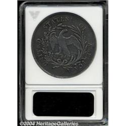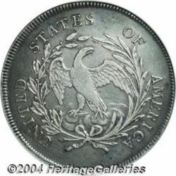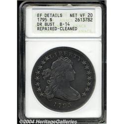 <B>1795<S$1> Draped Bust, Off Center--Repaired, Cleaned--ANACS. XF Details, Net VF20.</B></I> B-14, BB-51, R.1. After close examination, an almost imperceptible repair is seen in the obverse field to the right of the 5 in the date, and wispy hairline patches are observed beneath a layer of light-gray toning. A couple of the stars are weak in the center, but the design elements generally portray nice detail. The surfaces of this Draped Bust, Small Eagle dollar are relatively clean, showing only a few scattered, toned-over handling marks, especially on the obverse.<BR><I>From The Paulsboro Collection, Part Two.</B></I> <BR><BR><B>Important notice:</B> Heritage usually auctions material at the rate of 200-250 lots per hour. On some occasions eBay Live bid software or the Internet may not be able to keep up with the pace of the auction. We recommend placing a realistic absentee bid now as insurance to avoid disappointment. Occasionally the auctioneer may eliminate or reject an eBay Live bid, and the auctioneer may also reopen a lot after the close of the eBay live bidding (usually because we missed an audience bid), and may reject your bid even if it shows you as the winning bidder. By bidding via eBay Live, you agree that Heritage may award the lot to another bidder at its sole discretion under the circumstances described above or any other reasonable circumstances. Since eBay bids are not shown to us until we open the lot on the floor, we treat those bids just like floor bids. In most cases the floor responds before the eBay bid is presented to us, due to Internet lag time, so for consistency we have made it a policy that floor bids are always considered first over tie eBay live bids. Also please note that all Heritage lots purchased through eBay Live carry a 20% Buyer's Premium. Please make sure you read the Terms and Conditions before you bid. </span></font></tr></table></td></tr></table>