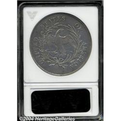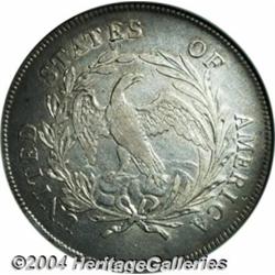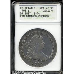 <B>1795<S$1> Draped Bust, Off Center--Rim Damaged, Cleaned--ANACS. XF Details, Net VF30.</B></I> B-14, BB-51, R.1. Obverse rim damage shows at 2, 5, and 8 o'clock, and hairlines are evident over somewhat bright surfaces beneath a layer of light-gray toning. The stars along the right border are soft in the centers, but as a whole, the design elements reveal nice detail. Aside from the previously noted rim damage, the surfaces of this Draped Bust, Small Eagle dollar are minimally abraded, with the most notable mark in the right obverse field to the right of Liberty's mouth.<BR><I>From The Paulsboro Collection, Part Two.</B></I> <BR><BR><B>Important notice:</B> Heritage usually auctions material at the rate of 200-250 lots per hour. On some occasions eBay Live bid software or the Internet may not be able to keep up with the pace of the auction. We recommend placing a realistic absentee bid now as insurance to avoid disappointment. Occasionally the auctioneer may eliminate or reject an eBay Live bid, and the auctioneer may also reopen a lot after the close of the eBay live bidding (usually because we missed an audience bid), and may reject your bid even if it shows you as the winning bidder. By bidding via eBay Live, you agree that Heritage may award the lot to another bidder at its sole discretion under the circumstances described above or any other reasonable circumstances. Since eBay bids are not shown to us until we open the lot on the floor, we treat those bids just like floor bids. In most cases the floor responds before the eBay bid is presented to us, due to Internet lag time, so for consistency we have made it a policy that floor bids are always considered first over tie eBay live bids. Also please note that all Heritage lots purchased through eBay Live carry a 20% Buyer's Premium. Please make sure you read the Terms and Conditions before you bid. </span></font></tr></table></td></tr></table>