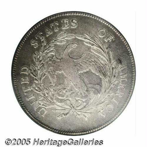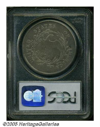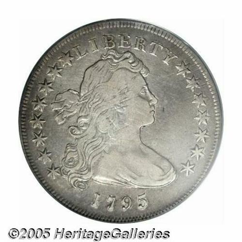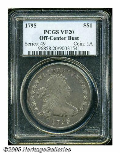 <B>1795<S$1> Draped Bust, Off Center VF20 PCGS.</B></I> B-14, BB-51. A muted steel-gray example with pale golden-orange peripheral accents. Several lengthy adjustment marks on the right side of the obverse are partially obliterated (on the highest points) by the 40 points of circulation and a few others are seen along the upper left periphery.