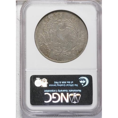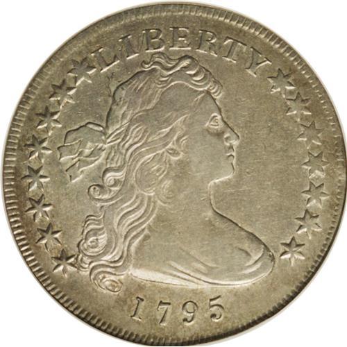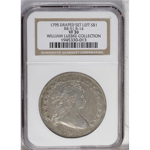 <B>1795 S$1 Draped Bust, Uncentered Bust VF30 NGC.</B></I> B-14, BB-51, R.2. Die State I. Star 1 joins middle hair curl; paired berries below left side of first S. Perfect dies as always. The bust of Liberty was poorly placed in the obverse die, well left of center, giving an unbalanced look to the design. The silver dollars represent the first appearance of this Draped Bust motif, which was eventually utilized for all denominations of silver and copper coins. The surfaces are light silver-gray, with prominent splashes of gold toning and an excellent appearance, save for a few short scratches at LIB. Specialists generally consider this variety to be the first 1795 Draped Bust variety, although a case could be made for either variety appearing first in the emission sequence. The uncentered bust and the existence of high quality examples suggest to some that this variety was struck first. Alternatively, the reuse of the reverse die in 1796, 1797, and 1798 suggests that it may have been struck second. It is a plentiful variety that is available in just about any grade desired, including Mint State, although the typical piece is in the lower VF grade level.<BR><I>Ex: Lano Balulesco (7/2001).</B></I><BR><I>From The William Luebke Collection.</B></I><BR><BR><b>Shipping:</b> Coin/Currency (<a target="_blank" href="http://www.heritageauctions.com/common/shipping.php">view shipping information</a>)
