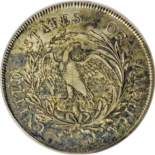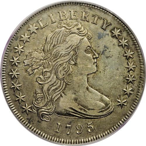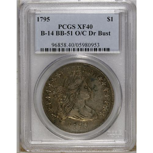<B>1795 S$1 Draped Bust, Off Center XF40 PCGS.</B></I> B-14, BB-51, R.2. The bust of Liberty was placed too far left; the highest wave of hair is under the B of LIBERTY. Nicely defined on the motifs, including bold dentilation on both sides. Golden-gray surfaces display occasional splotches of medium blue. A couple of vertical linear marks on the reverse are mentioned for accuracy.<BR><BR><b>Shipping:</b> Coins & Currency (<a target="_blank" href="http://www.heritageauctions.com/common/shipping.php">view shipping information</a>)