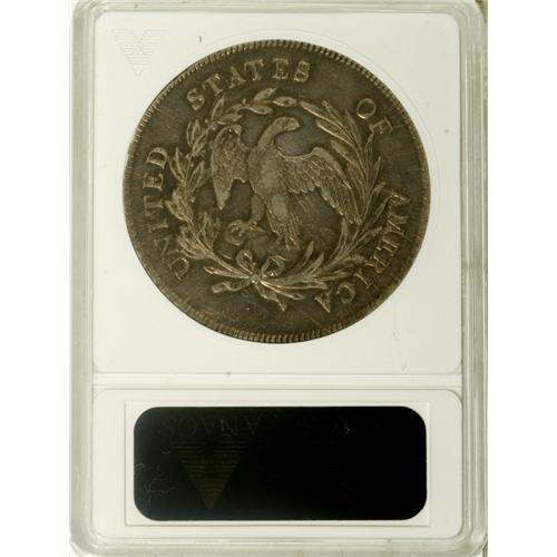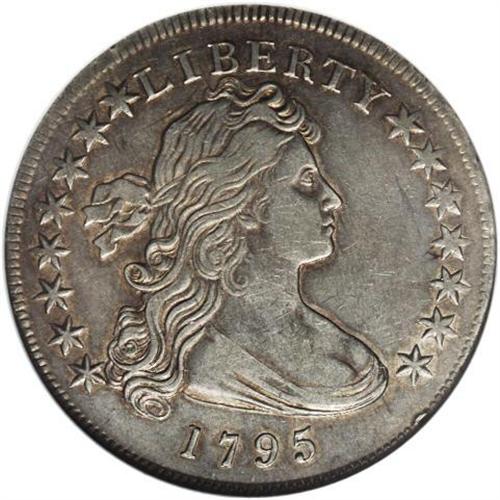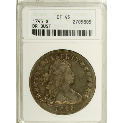 <B>1795 S$1 Draped Bust, Uncentered Bust XF45 ANACS.</B></I> B-14, BB-51, R.2. The two 1795 Draped Bust varieties are known as the Centered Bust and Uncentered Bust, the latter also sometimes termed the Off Center Bust variety. Both sides have attractive pewter-gray color that is blended with medium gold toning. The reverse has light adjustment marks that cover nearly half the surface.<BR><BR><b>Shipping:</b> Coins & Currency (<a target="_blank" href="http://www.heritageauctions.com/common/shipping.php">view shipping information</a>)