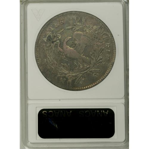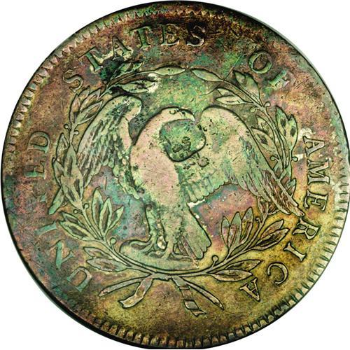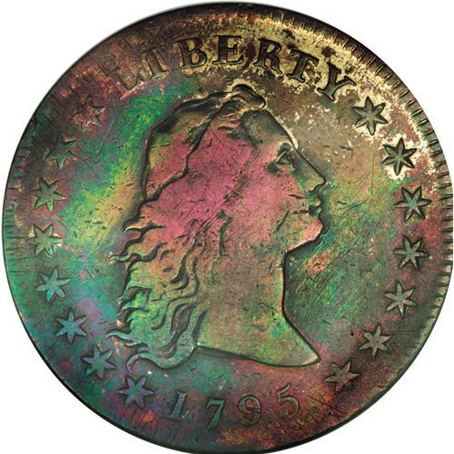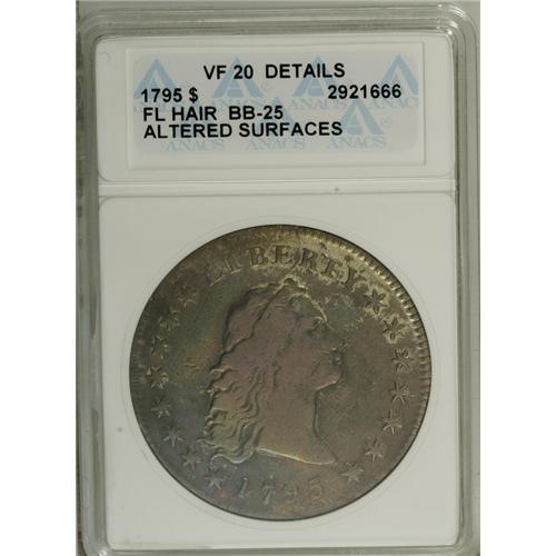<B>1795 S$1 Flowing Hair, Three Leaves--Altered Surfaces--ANACS. VF20 Details.</B></I> B-6, BB-25, R.3. The ruby-red, sea-green, and gold patina is both bright and suspicious. A polished piece with an abraded right obverse field and moderate obverse adjustment marks. The reverse is lightly pitted above the left (facing) wing and beneath the eagle's beak. A challenging large denomination early silver type.<BR><BR><b>Shipping:</b> Coin/Currency (<a target="_blank" href="http://www.heritageauctions.com/common/shipping.php">view shipping information</a>)