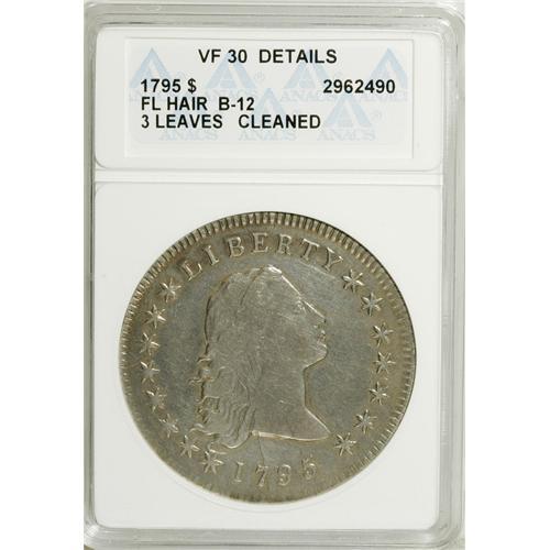 <B>1795 S$1 Flowing Hair, Three Leaves--Cleaned--ANACS. VF30 Details.</B></I> B-12, BB-26, R.6. The heavy vertical die crack through the 7 in the date helps identify this rare Flowing Hair Bolender variety. Light golden-brown toning visits protected areas, although the devices are steel-gray. Hairlined and a bit glossy from a cleaning, and the obverse has minor adjustment marks below the ear and near the date.<BR><BR><b>Shipping:</b> Coins & Currency (<a target="_blank" href="http://www.heritageauctions.com/common/shipping.php">view shipping information</a>)