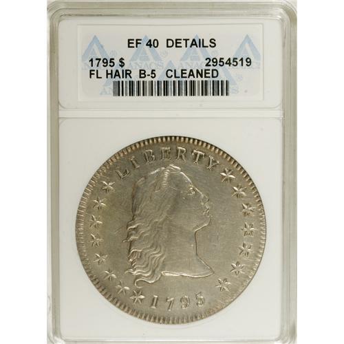 <B>1795 S$1 Flowing Hair, Three Leaves--Cleaned--ANACS. XF40 Details.</B></I> B-5, BB-27, R.1. A lightly toned and moderately hairlined tan and pearl-gray example that retains noticeable satin luster. Wear is minimal for the grade, and concentrated on the eagle's breast. The bust is widely strike doubled along the profile, although the remainder of the design is free from doubling.<BR><I>From The Hoosier Discovery Collection.</B></I><BR><BR><b>Shipping:</b> Coins & Currency (<a target="_blank" href="http://www.heritageauctions.com/common/shipping.php">view shipping information</a>)