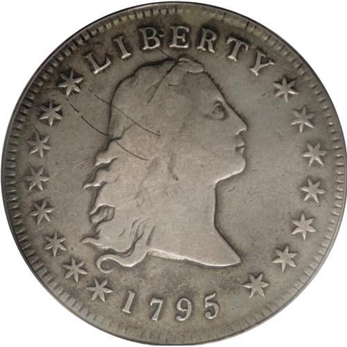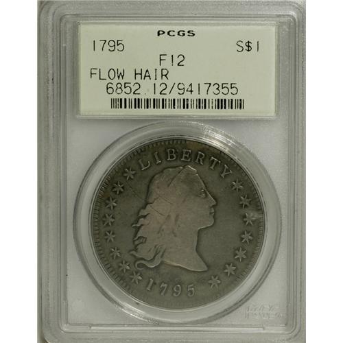 <B>1795 S$1 Flowing Hair, Three Leaves Fine 12 PCGS.</B></I> B-5, BB-27, R.1. Medium-gray surfaces with lighter pinkish-silver highpoints show on this pleasing Fine specimen of the most available early dollar variety. A couple of old scrapes appear on each side along with a circular small abrasion right of the B in LIBERTY, but there are no adjustment marks or other singular distractions. An affordable example from this enduring die marriage, certified in an old green-label holder.<BR><BR><b>Shipping:</b> Coins & Currency (<a target="_blank" href="http://www.heritageauctions.com/common/shipping.php">view shipping information</a>)