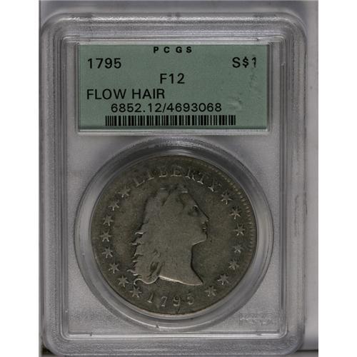 <B>1795<img border='0' src='http://www.heritagecoins.com/images/star.gif' width=10 height=10>$1> Flowing Hair, Three Leaves Fine 12 PCGS.</B></I> B-6, BB-25, R.3. Die State III, with four leaves below the first S in STATES. A well circulated example that has smooth, even wear over each side and no mentionable marks or problems. Struck from slightly rotated dies. Housed in an early PCGS holder with a green insert.<BR><I>From The Carolina Gold Collection, Part Four.</B></I>