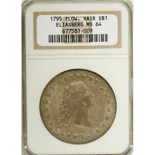 <B>1795 S$1 Flowing Hair, Three Leaves MS64 NGC.</B></I> B-5, BB-27, R.1. Die State III. Although this is undoubtedly the most common 1795 silver dollar variety, and actually one of the most common varieties in the entire series of early dollars from 1794 to 1803, it is almost never encountered in such a fine state of preservation. In fact, it is our opinion that this piece is one of the top three or four examples of this die variety known to exist.<BR> It is a pleasure for this cataloger, who wrote the Eliasberg description, to revisit this piece after 10 years, writing a decade ago: "Notwithstanding whatever numerical grade is assigned--and certainly a liberal Mint State number is in order--the coin ranks extremely high on the scale for aesthetic appeal. The surfaces are a delightful mixture of light lilac and gold, another Eliasberg coin that is absolutely incredible in its beauty. The striking is above average, with good detail (considering the variety) at the centers, even at the high part of the eagle's body, although not with full feather definition. The dentils frame the coin nicely, as is the case with a number of varieties of this year. The rim is somewhat flat on the dentils opposite stars 5-8." Although assigned a higher grade today, as it was only called MS62 in the Eliasberg catalog, this coin has not changed over the last 10 years, in an era when so many coins are enhanced or conserved. It appears exactly the same today as it did in 1997. The surfaces have satiny luster and the fields are essentially unimpaired. The coloration gives a distinctive look that is only found on coins from old time collections.<BR><I>Ex: E.W. Ropes Collection (New York Coin & Stamp Co., 2/1899); J.M. Clapp; John H. Clapp; Clapp Estate (1942); Louis E. Eliasberg, Sr.; Eliasberg Estate (Bowers and Merena, 4/1997), lot 2172.</B></I><BR><I>From The Essex Palm Collection.</B></I><BR><BR><b>Shipping:</b> Coin/Currency (<a target="_blank" href="http://www.heritageauctions.com/common/shipping.php">view shipping information</a>)