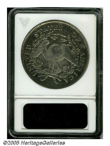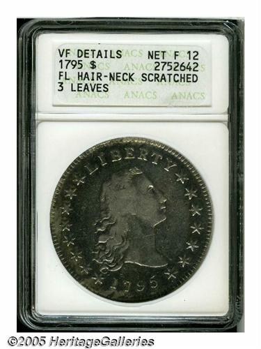 <B>1795<S$1> Flowing Hair, Three Leaves--Neck Scratched--ANACS. VF Details, Net Fine 12.</B></I> B-7, BB-18, R.3. This reverse is most easily attributable by the die flaws at the end of the left (facing) ribbon end. Evenly worn, the unnaturally bright underlying surfaces suggest an old cleaning, but most of each side has subsequently toned a medium gray. In addition to the horizontal scratch across the neck of Liberty, there are several adjustment marks on the lower reverse.