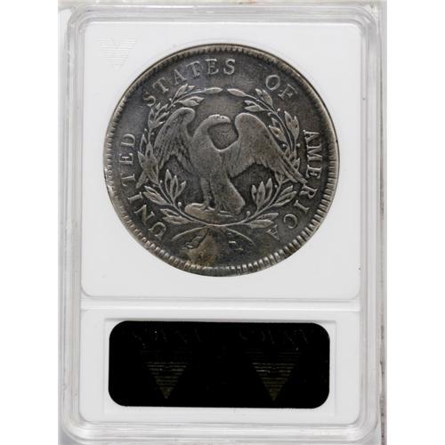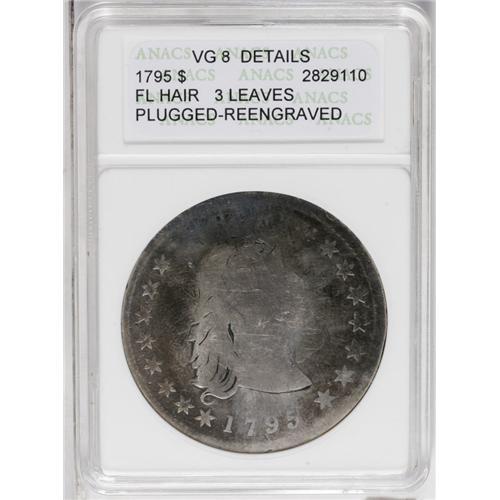 <B>1795<img border='0' src='http://www.heritagecoins.com/images/star.gif' width=10 height=10>$1> Flowing Hair, Three Leaves--Plugged, Re-engraved--ANACS. VG8 Details.</B></I> B-5, BB-27, R.1. A relatively large circular plug affects the BE in LIBERTY and opposite on the left ribbon end. Design details have been re-engraved over the plug, and some details have been added or strengthened on the portrait. The obverse field is extensively tooled, and both sides are glossy from cleaning.