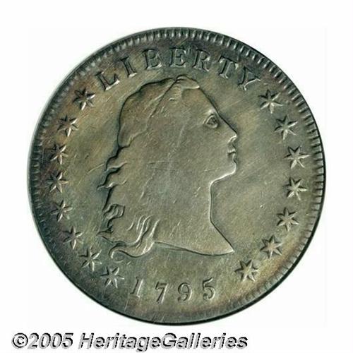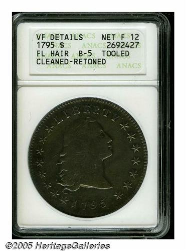 <B>1795<S$1> Flowing Hair, Three Leaves--Tooled, Cleaned, Retoned--ANACS. VF Details, Net Fine 12.</B></I> B-5, BB-27, R.1. Aquamarine and apricot colors embrace this polished piece. A thorough evaluation detects probable tooling of the reverse field above the eagle's head. The eagle's wings and the wreath have considerable definition for the net grade.