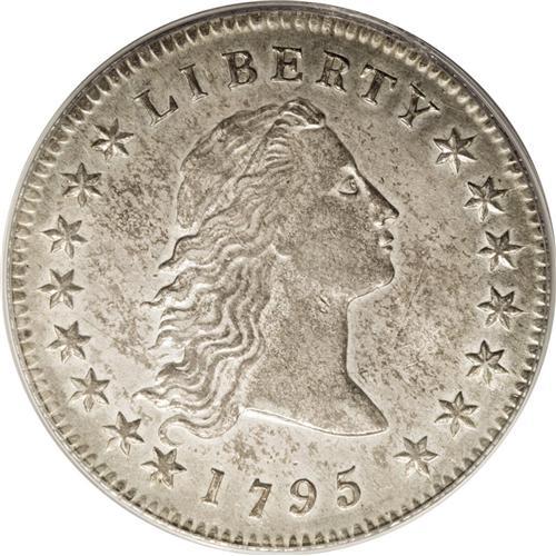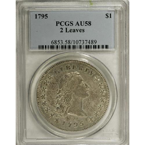 <B>1795 S$1 Flowing Hair, Two Leaves AU58 PCGS.</B></I> B-1, BB-21, R.2. All examples of this variety were struck from perfect dies with no apparent defects on either side, although this example does show faint clash marks near the upper hair curls. Liberty has flowing hair with six hair curls (points), but only five are easily visible. The middle curl, third from the bottom, is merely an isolated tip in the field.<BR> Like most known examples of this variety, this piece has sharp design definition, including full central star details on the obverse. It is fully lustrous with only a trace of wear on the high points of the design. Light silver-gray surfaces have wispy golden-brown toning on both sides. While a common variety, most examples that have survived through the years grade in the VF to XF range, with AU or finer coins seen only occasionally. About 10 or 12 Mint State coins still exist. This attractive coin is nicely centered with full obverse and reverse borders, and the surfaces are exceptional for the grade. There are no apparent blemishes on either side, and no evidence of any adjustment marks.<BR> Over many years, quite a few AU examples of this variety have appeared for sale in public auctions. While it should not be difficult to match this piece to a past auction catalog photograph, we are not aware of any pedigree information that is currently available. Population: 14 in 58, 12 finer (12/06).<BR><BR><b>Shipping:</b> Coins & Currency (<a target="_blank" href="http://www.heritageauctions.com/common/shipping.php">view shipping information</a>)