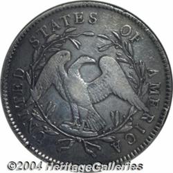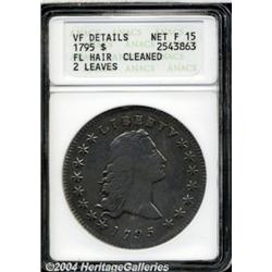 <B>1795<S$1> Flowing Hair, Two Leaves--Cleaned--ANACS. VF Details, Net Fine 15.</B></I> B-1, BB-21. The 1 underdigit beneath the 7 is especially pronounced on this piece. The centers are a medium, shiny gray color with notable evidence of cleaning on each side. Still, a pleasing example and a wonderful type coin. <BR><BR><B>Important notice:</B> Heritage usually auctions material at the rate of 200-250 lots per hour. On some occasions eBay Live bid software or the Internet may not be able to keep up with the pace of the auction. We recommend placing a realistic absentee bid now as insurance to avoid disappointment. Occasionally the auctioneer may eliminate or reject an eBay Live bid, and the auctioneer may also reopen a lot after the close of the eBay live bidding (usually because we missed an audience bid), and may reject your bid even if it shows you as the winning bidder. By bidding via eBay Live, you agree that Heritage may award the lot to another bidder at its sole discretion under the circumstances described above or any other reasonable circumstances. Since eBay bids are not shown to us until we open the lot on the floor, we treat those bids just like floor bids. In most cases the floor responds before the eBay bid is presented to us, due to Internet lag time, so for consistency we have made it a policy that floor bids are always considered first over tie eBay live bids. Also please note that all Heritage lots purchased through eBay Live carry a 20% Buyer's Premium. Please make sure you read the Terms and Conditions before you bid. </span></font></tr></table></td></tr></table>