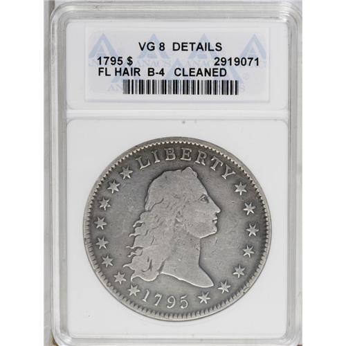 <B>1795 S$1 Flowing Hair, Two Leaves--Cleaned--ANACS. VG Details.</B></I> B-4, BB-14, R.3. Attributed by star 15 completely "hidden" below the bust, the only 1795 obverse with this characteristic. Pleasing light gray patina becomes slightly darker toward the margins. The design elements are well centered and show fairly nice detail for the grade, though portions of the eagle are a bit smooth. Fine hairlines are more apparent on the reverse, but overall do not seriously detract from the quality of this early dollar.<BR><BR><b>Shipping:</b> Coin/Currency (<a target="_blank" href="http://www.heritageauctions.com/common/shipping.php">view shipping information</a>)