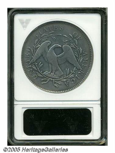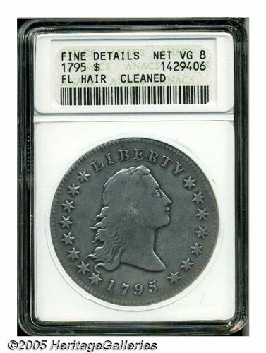 <B>1795<S$1> Flowing Hair, Two Leaves--Cleaned--ANACS. Fine Details, Net VG8.</B></I> B-1, BB-21, R.1. All major design details are apparent on this hairlined and cloudy pearl-gray early dollar. About half of the wing feathers are present.