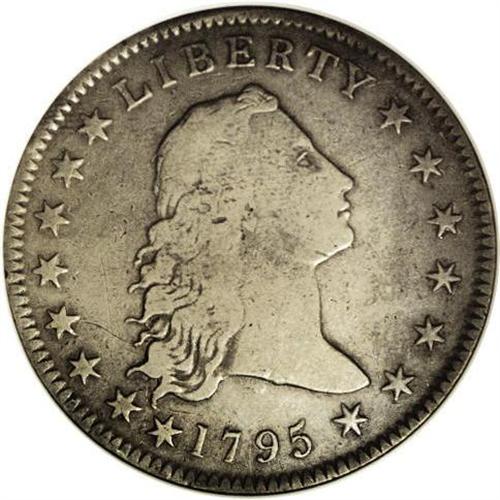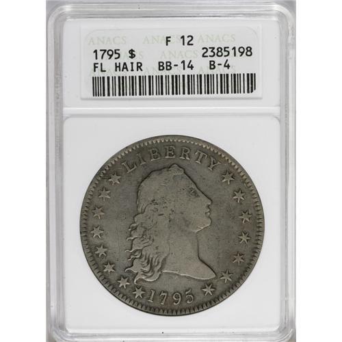 <B>1795 S$1 Flowing Hair, Two Leaves Fine 12 ANACS.</B></I> B-4, BB-14, R.3. Star 15 completely below bust; single tail berry, leaf tip below inner right base of A in STATES. Die State I with perfect dies as always. The obverse die was only used for this B-4 variety, therefore the "hidden star" characteristic is a diagnostic attribution point. This variety may be borderline R.4 with about 200 to 250 examples known, although some have estimated the surviving population at a higher number. A nice coin for the grade due to the even strike and wear the coin has experienced, all this presented on a surface pleasantly toned to a medium gray-brown. Each side has a few faint scratches, with a small prick below the eagle's right wing. Plenty of detail remains, with full obverse denticles and partial reverse denticles. The strong or high obverse border helped to preserve the existing detail, thus many survivors are in higher grades than most 1795 varieties. A few examples of this variety are known on silver-plugged planchets, and one example is known struck over a 1794 dollar. Such coins help to place the B-4 variety as one of the first struck during the year.<BR><I>Ex: Heritage (11/2001), lot 6982.</B></I><BR><I>From The William Luebke Collection.</B></I><BR><BR><b>Shipping:</b> Coin/Currency (<a target="_blank" href="http://www.heritageauctions.com/common/shipping.php">view shipping information</a>)