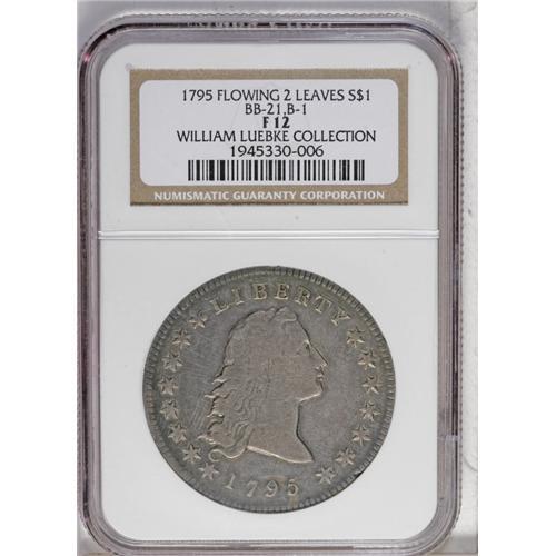 <B>1795 S$1 Flowing Hair, Two Leaves Fine 12 NGC.</B></I> B-1, BB-21, R.2. Digit 7 punched over 1 ("1795/1195"); double tail berry, outer berry at left base of I in AMERICA. Usual die state with perfect obverse and reverse dies. Pewter gray with darker steel peripheries. A few wispy lines are evident on Liberty's cheek. Nicely centered with full obverse and reverse borders. The B-1 die variety is easily the second most common 1795 Flowing Hair variety, only trailing the B-5 combination in terms of overall availability. In fact, examples of this variety are easily obtainable in virtually any grade desired, from Good to Mint State, making this an excellent choice for date or type collectors.<BR><I>Ex: eBay (2/2001).</B></I><BR><I>From The William Luebke Collection.</B></I><BR><BR><b>Shipping:</b> Coin/Currency (<a target="_blank" href="http://www.heritageauctions.com/common/shipping.php">view shipping information</a>)