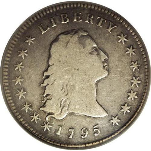 <B>1795 S$1 Flowing Hair, Two Leaves Fine 15 ICG.</B></I> B-2, BB-20, R.3. Diagonal bar at star 4; double tail berry, outer berry at left base of I in AMERICA. The inner point of star 1 completely pierces the lowest curl, which continues to nearly close a large circle. Die State II with the obverse lapped, apparently as always. The stars on the left are somewhat thin when compared to the stars on the right. These have been called "spidery" by some numismatists. The lapping also weakens the diagonal bar in the left obverse field, although it is still visible on this example. The obverse is two-tone with pewter-gray fields and light silver devices. The reverse is mostly lighter silver in color. A short scratch from the obverse border extends down to star 11, and a few shallow surface dents are evident under the right wing. Although this variety is scarce, it is not one of the impossibly rare varieties, and is usually available with a little patience. A few Mint State examples are known, but most survivors are well worn, grading no better than VF. Like the Reiver Collection specimen, this example has the reverse die rotated about 45 degrees clockwise. It is not known how many have similar rotation, although the cataloger for the Reiver dollars stated that that example was the first he had seen with die rotation.<BR><I>Ex: Evan Gale (2/2001).</B></I><BR><I>From The William Luebke Collection.</B></I><BR><BR><b>Shipping:</b> Coin/Currency (<a target="_blank" href="http://www.heritageauctions.com/common/shipping.php">view shipping information</a>)