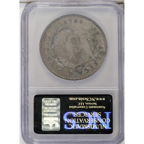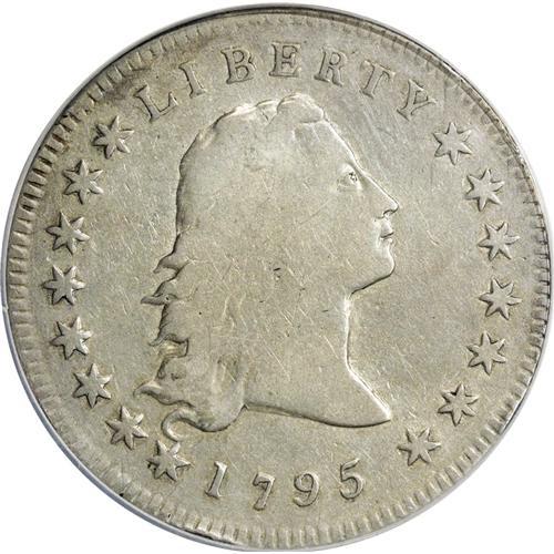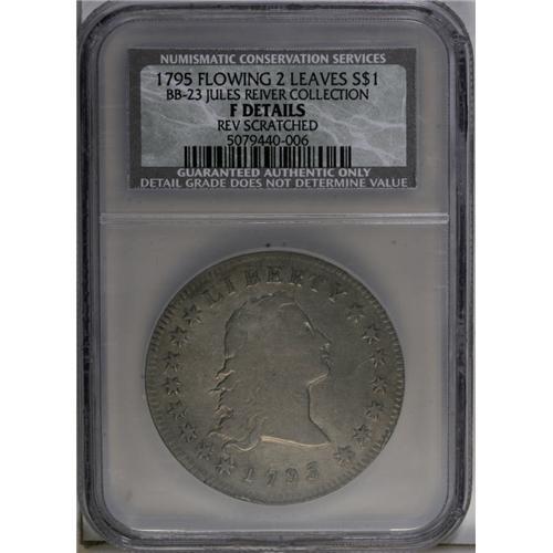 <B>1795 S$1 Flowing Hair, Two Leaves--Reverse Scratched--NCS. Fine Details.</B></I> B-16, BB-23, R.8. Digit 7 punched over 1 ("1795/1195"); double tail berry, berry below left base of N. Die State I, perfect dies as always. Reiver Die State a. Apparently just three examples of this die marriage are known, including one nearly Mint State example and another with a hole. This particular coin has light golden-gray color and appealing surfaces, although we note some minor rim nicks below the 17 of date and between stars 13 and 14 on the obverse, similarly on the reverse above OF and ER of AMERICA. Close examination of the obverse will note a few faint hairlines. On the reverse, there is an "X" scratched which extends from the upper left inside leaf through the head of the eagle, right wing, to the upper inside pair of leaves below that wing. The crossing line of the "X" is fainter and extends only from the center of the eagle's chest along the ridge of the wing to the center of the right wing. This scratch is evident under magnification, but not as distracting as if it had been etched on the obverse. No evidence of double striking on this coin, as seen on the most recent discovery of this die pairing which is double-struck on the obverse and reverse, but is also damaged by a hole. The discovery coin and finest known of this variety is the Ostheimer coin, which is an attractive AU50 or higher example. That coin was sold by Superior Stamp and Coin three times over a few years (October 4, 1973, lot 1218; August 1975, lot 811; and February 1977, lot 468), and it remains in an advanced collection since the time of the 1977 sale. The present offering is an extraordinary opportunity for the specialist to obtain one of the most difficult die pairings of the entire series. <B>This specimen is the plate coin for Reiver's <I>The United States Early Silver Dollars 1794-1803</B></I> and the Bowers-Borckardt <I>Silver Dollar Encyclopedia.</B></I></B></I><BR><I>Ex: Early 1980s coin show, unattributed; H. Rolland Willasch (11/13/1989); Jules Reiver Collection (Heritage, 1/2006), lot 23480.</B></I><BR><I>From The William Luebke Collection.</B></I><BR><BR><b>Shipping:</b> Coin/Currency (<a target="_blank" href="http://www.heritageauctions.com/common/shipping.php">view shipping information</a>)