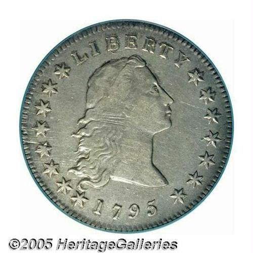 <B>1795<S$1> Flowing Hair, Two Leaves VF30 PCGS.</B></I> B-1, BB-21, R.1. Steel-gray color in dashes of gold patina. Traces of luster are still present on the reverse, outlining the wreath and legends. Moderate adjustment marks, as produced by the early mint, are found on the obverse at 9 o'clock and beneath Liberty's ear. Quite smooth for the most part; a couple of relatively unimportant marks above the left (facing) wing are mentioned for pedigree purposes.