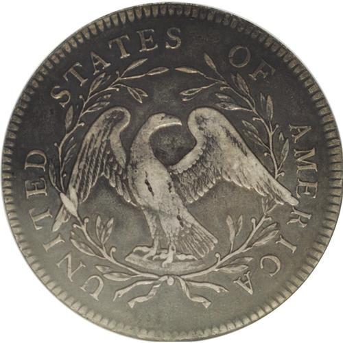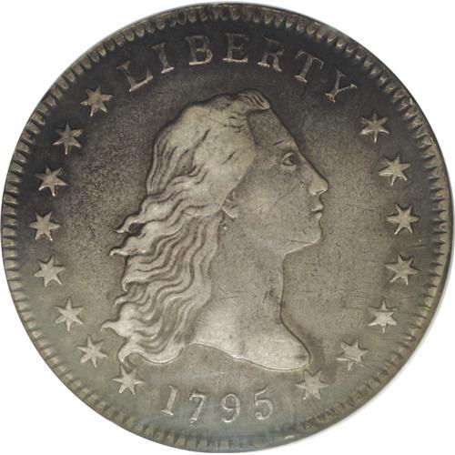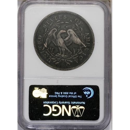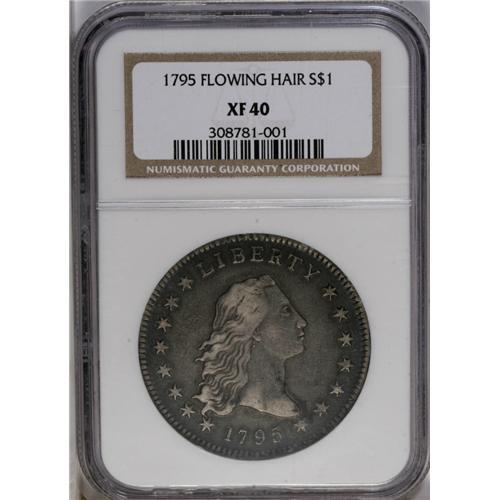 <B>1795<img border='0' src='http://www.heritagecoins.com/images/star.gif' width=10 height=10>$1> Flowing Hair, Two Leaves XF40 NGC.</B></I> B-9, BB-13, R.3. Die State I. The reverse die is identified by the arrangement of nine berries left and eight right. This die was mated with two obverse dies, the present variety having star 15 at the bust point. The other variety, B-4, BB-14, has star 15 well below the bust tip, hidden from Liberty's gaze. Unclashed, as usual. The surfaces are charcoal-gray overall with silvery-gray accents over the highpoints of the design. There are a couple of vertical planchet flaws on the breast of the eagle, several faint adjustment marks on the right side of the obverse, and some porosity in the left obverse field. Well centered, and a pleasing example for the type, date, or variety collector.