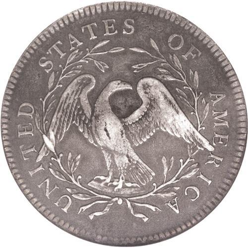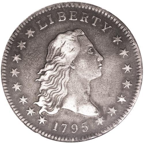 <B>1795<img border='0' src='http://www.heritagecoins.com/images/star.gif' width=10 height=10>$1> Flowing Hair, Two Leaves XF40 NGC.</B></I> B-9, BB-13, R.3. Die State I. The reverse die is identified by the arrangement of nine berries left and eight right. This die was mated with two obverse dies, the present variety having star 15 beneath the bust point. The other variety, B-4, BB-14, has star 15 above the bust tip. Unclashed, as usual. The surfaces are charcoal-gray overall with silvery-gray accents over the highpoints of the design. There are a couple of vertical planchet flaws on the breast of the eagle, several faint adjustment marks on the right side of the obverse, and a minor bruise on the obverse rim at 5:30. Given the sharpness of detail on Liberty's hair and the eagle's wings and tail, expect strong collector competition when this piece reaches the auction podium.