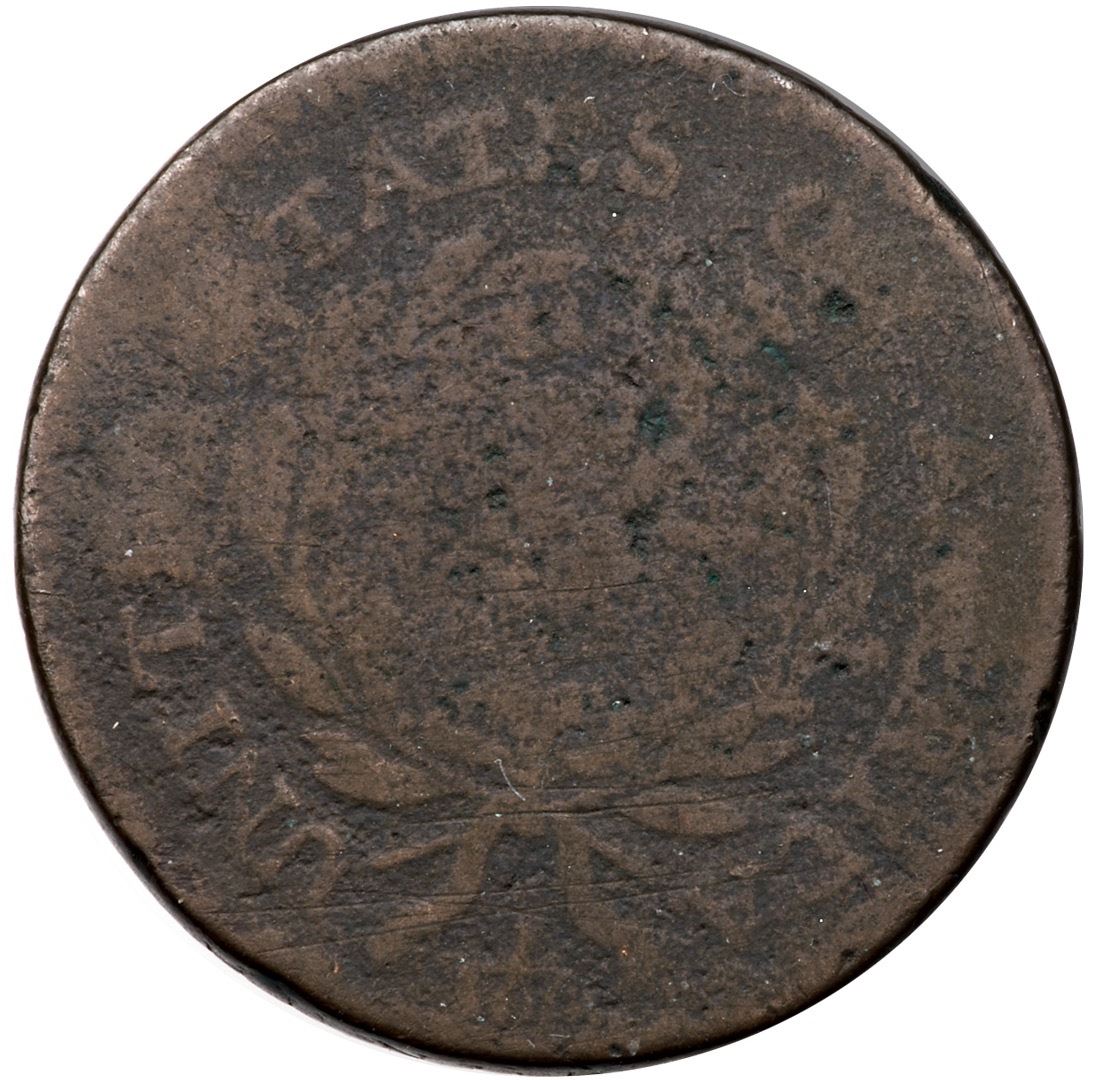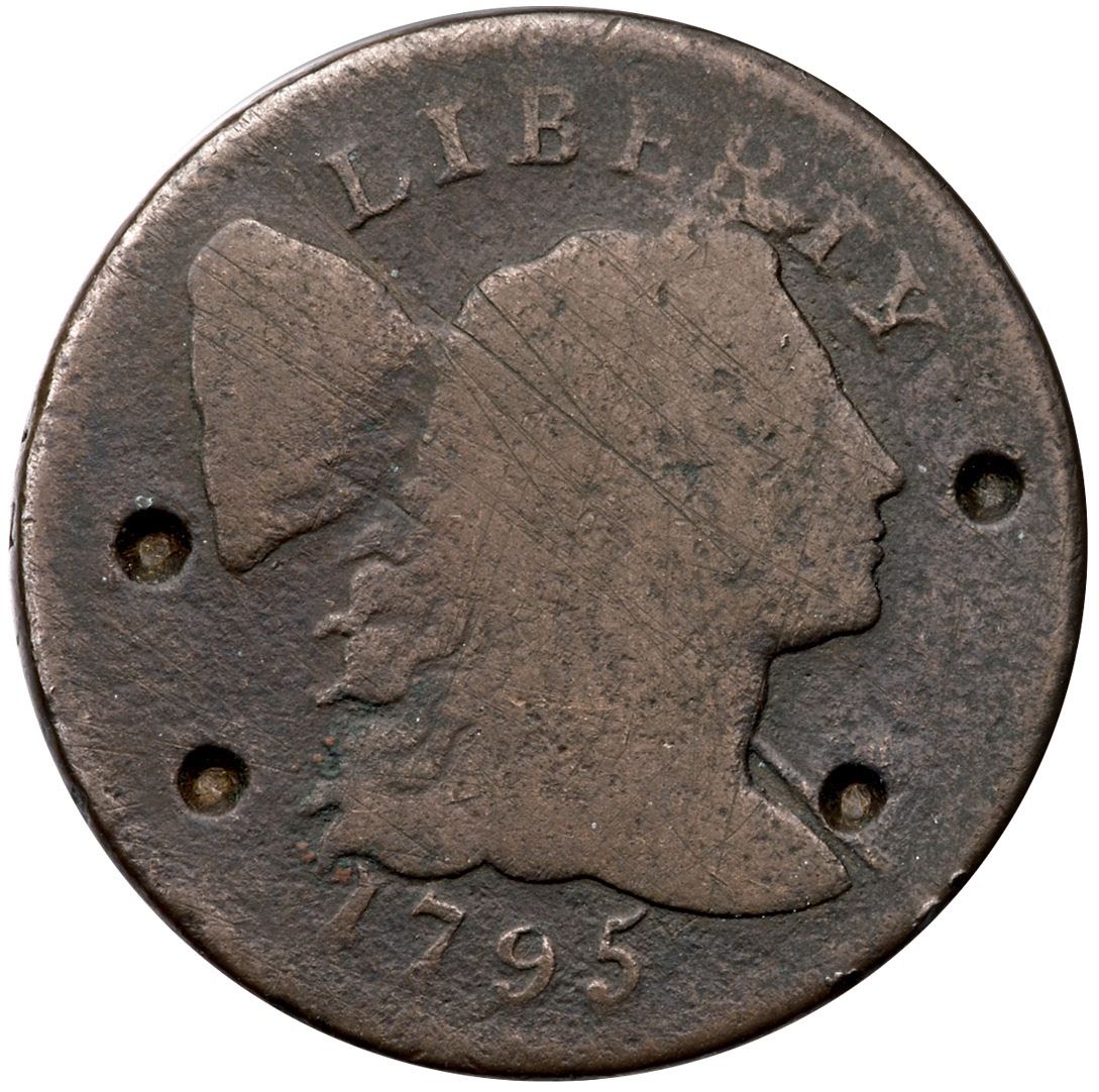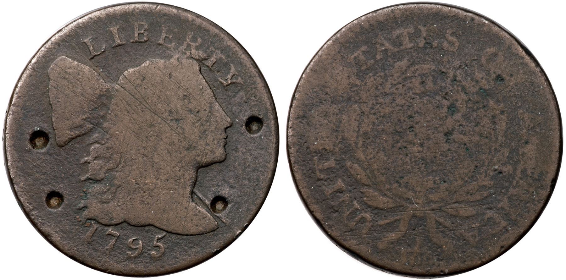 1795 S-73 R-5+ Blundered Edge FR2A couple points sharper but there are four punch marks drilled in to the obverse fields. There are also old hairline scratches and fine roughness on both sides. Dark brown, lighter medium brown on the devices. Blundered edge "One Hundred A Dollar". Graded "G4 but mutilated" by Del Bland. LDS, Brenn State IV. Ex; EAC 1979 lot 9 - Dan Holmes - Clay Everhart 4/2016 - Red Henry