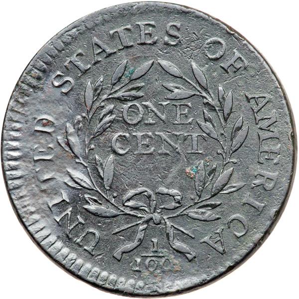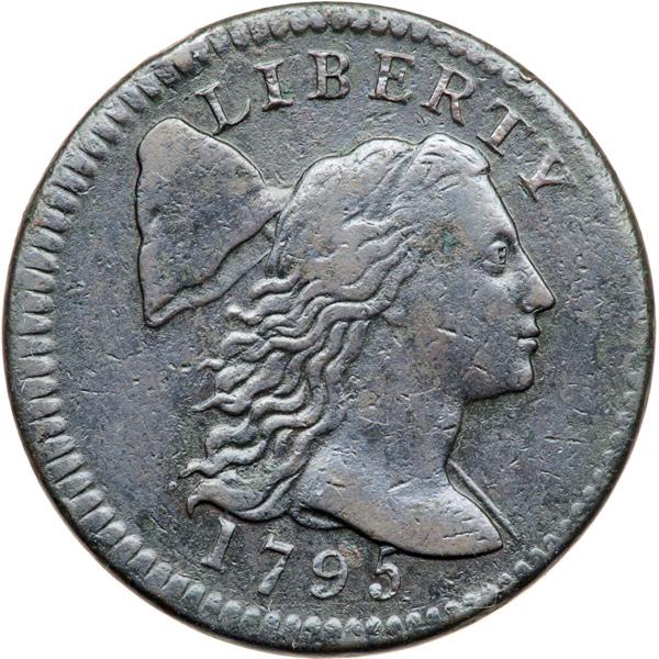 1795 S-76b Plain Edge R1. Fine-15. Sharpness VF35 but there is a patch of shallow planchet erosion weakening ITED in UNITED plus a couple small spots of raised greenish corrosion on both sides, the largest of these at the fraction. The remainder of the planchet is glossy and attractive, and a small rim bruise at the L in LIBERTY is the only notable sign of contact. Glossy dark olive and steel. E-MDS, Breen state IV early, showing a hint of swelling in the field before the portrait and sharp die clashmarks on the reverse. Struck slightly off center to K-3. Looks better than the assigned grade, especially on the obverse.