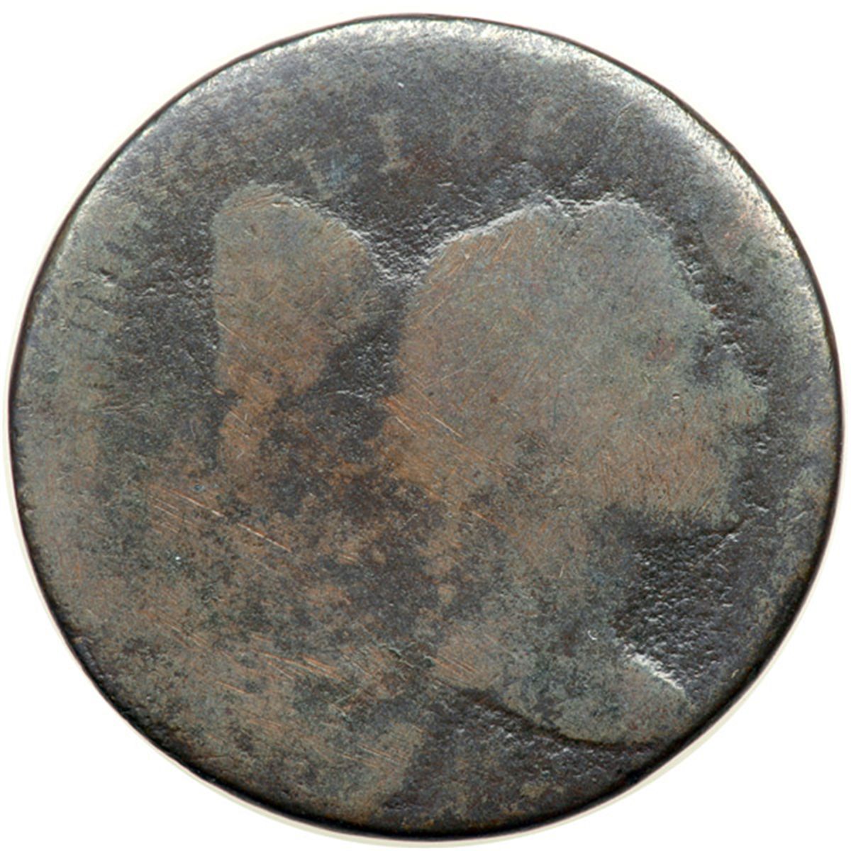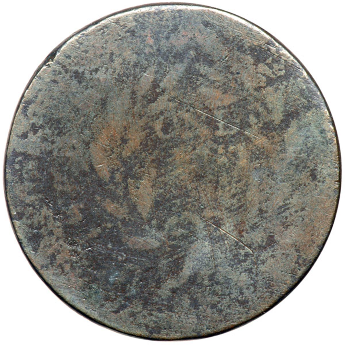 1795 S-76b R1 Plain Edge Fair-2. Off Center. Glossy chocolate and steel brown, the devices a lighter shade than the fields. There are areas of fine roughness and hairline scratches on both sides, but they are not significant given the heavy wear. The date is essentially gone as are most of the legends. But there is more than enough remaining to be certain of the variety. What makes this piece special is that it was struck 10% off center to K-4.5.