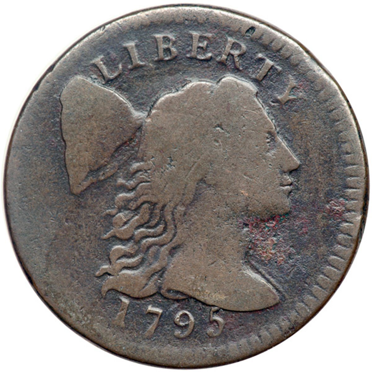 1795 S-76b R1 Plain Edge G4. The obverse is slightly better while the reverse is weaker, the G4 grade an average of the two sides. The surfaces are mostly smooth and glossy but there is a patch of shallow corrosion in the field before the throat. Two-tone glossy chocolate brown, the devices a couple shades lighter than the fields on both sides. E-MDS, before any swelling in the obverse fields. The date is bold and the legends are weak but readable.