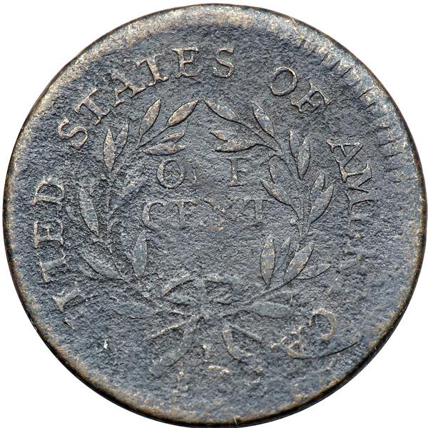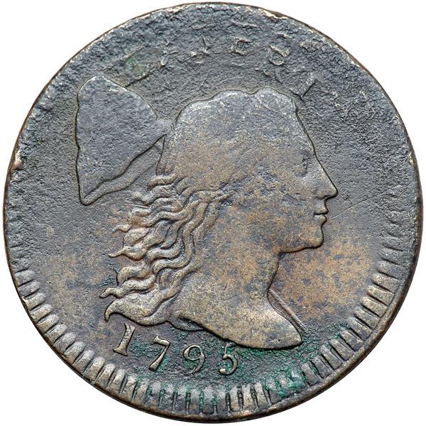 1795 S-76b R1 Plain Edge G6. Flipover Double Strike. Sharpness F15 or slightly better on the lower half of the obverse, but the upper half of the obverse and the entire reverse are covered with light to moderate corrosion. Shallow greenish verdigris shows around the date and under the bust tip. The only notable sign of contact is a small rim nick left of the bottom of the cap. Partly glossy dark olive mixed with lighter chocolate toning on the lower half of the obverse where the surface is smooth and attractive. This piece was struck slightly off center to K-5, then flipped over and struck a second time with the second strike reasonably well centered on the planchet. Undertype from the initial strike shows on both sides. TATES from STATES is visible slightly above LIBER and the bust tip from that initial strike is visible at CA in AMERICA. In addition, the 17 of the date from the first strike can be made out where the denominator of the fraction should be located. Too bad about the corrosion because this is a very rare type of mint error.